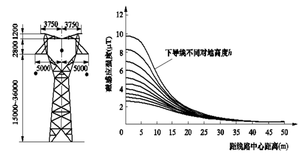 圖1列舉了220kV電壓等級(jí),采用貓頭型鐵塔,三相單回路,導(dǎo)線呈三角型布置的輸電線路下,離地1m高度處的磁場(chǎng)橫向分布計(jì)算曲線。曲線以鐵塔中心線為坐標(biāo)原點(diǎn)(O點(diǎn)),顯示了磁感應(yīng)強(qiáng)度(磁通密度)隨距離的衰減關(guān)系。該圖曲線對(duì)應(yīng)的計(jì)算線路電流為300A(采用LGJ—300鋼芯鋁絞線),圖中曲線自上至下對(duì)應(yīng)導(dǎo)線對(duì)地計(jì)算高度h分別為8、9、10、11、12、13、14、15、16、17m。