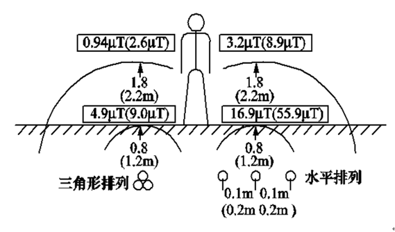 對(duì)于三相地下電纜輸配電線路,在其敷設(shè)位置上方地面所產(chǎn)生的磁場(chǎng)水平,取決于電纜埋設(shè)深度、3條相線之間的距離、導(dǎo)線的相對(duì)排列方式以及電纜中的工作電流。將三相3根電纜的間距減小,由于不同相位的三相磁場(chǎng)互相抵消的作用,可明顯降低地面的磁場(chǎng);采用3芯電纜或?qū)⑷鄦涡倦娎|布置成三角形也可有效降低地面磁場(chǎng)。圖3-6給出了工作電流為300A的中壓(10~20kV)電纜(圖中括號(hào)外數(shù)據(jù))和工作電流為600A的高壓(110kV)電纜(圖中帶括號(hào)數(shù)據(jù))在常規(guī)埋設(shè)深度下產(chǎn)生的地面工頻磁感應(yīng)強(qiáng)度數(shù)值及分布示意圖。由圖3可見(jiàn),在直接敷設(shè)地下電纜的地面上方路段,工頻磁感應(yīng)強(qiáng)度可達(dá)到10μT數(shù)量級(jí),其數(shù)值比相應(yīng)架空線路產(chǎn)生的磁場(chǎng)更高,但其影響范圍相對(duì)較小。同樣的分析結(jié)論也可見(jiàn)于美國(guó)南加州愛(ài)迪生電力公司的設(shè)計(jì)導(dǎo)則中。