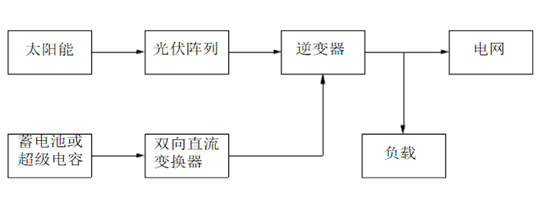 下圖是一個(gè)太陽能光伏并網(wǎng)發(fā)電系統(tǒng)示意圖,該系統(tǒng)由太陽能、光伏陣列、雙向直流變換器、蓄電池或超級(jí)電容和并網(wǎng)逆變器構(gòu)成。