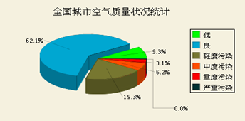7月7日全國(guó)城市空氣質(zhì)量日?qǐng)?bào)對(duì)全國(guó)城市空氣質(zhì)量狀況的檢測(cè)結(jié)果做了詳細(xì)的介紹,其中監(jiān)測(cè)指標(biāo)為空氣質(zhì)量指數(shù),即air quality index(AQI)。其中,3.1%的城市為重度污染,6.2%的城市為中度污染,19.3%的城市為輕度污染,62.1%的城市空氣質(zhì)量為良,僅有9.3%的城市空氣質(zhì)量為優(yōu)。