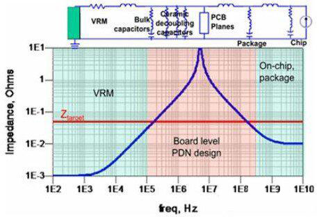 在調(diào)試該故障前先回顧下電源噪聲抑制的原理。如下圖所示,電源分配網(wǎng)絡(luò)中不同的頻段由不同的元件來(lái)抑制噪聲,去耦元件包含電源調(diào)整模塊(VRM)、去耦電容、PCB電源地平面對(duì)、器件封裝和芯片。VRM包含電源芯片及外圍的輸出電容,大約作用于DC到低頻段(100K左右),其等效模型是一個(gè)電阻和一個(gè)電感組成的二元件模型。去耦電容*好使用多個(gè)數(shù)量級(jí)容值的電容配合使用,充分覆蓋中頻段(數(shù)10K到100M左右)。由于布線(xiàn)電感和封裝電感的存在,即時(shí)大量堆砌去耦電容也難以在更高頻起到作用。PCB電源地平面對(duì)形成了一個(gè)平板電容,也具有去耦作用,大約作用在數(shù)十兆。芯片封裝和芯片負(fù)責(zé)高頻段(100M以上),目前的高端器件一般會(huì)在封裝上增加去耦電容,此時(shí)PCB上的去耦范圍可以降低到數(shù)十兆甚至幾兆。因此,在電流負(fù)載不變的情況下,我們只要判斷出電壓噪聲出現(xiàn)在哪個(gè)頻段,那么針對(duì)這個(gè)頻段所對(duì)應(yīng)的去耦元件進(jìn)行優(yōu)化即可。在兩個(gè)去耦元件的相鄰頻段時(shí)兩個(gè)去耦元件會(huì)配合作用,所以在分析去耦元件臨界點(diǎn)時(shí)相鄰頻段的去耦元件也要同時(shí)納入考慮。