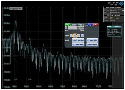 電源噪聲測(cè)量時(shí)不要求較高的采樣率,所以可以設(shè)置很長(zhǎng)的時(shí)基,這也意味著采集的信號(hào)時(shí)間可以足夠長(zhǎng),可以認(rèn)為覆蓋到了整個(gè)有效信號(hào)的時(shí)間跨度,此時(shí)不需要添加窗函數(shù)。調(diào)整以上設(shè)置可以得到比較準(zhǔn)確的FFT變換曲線(xiàn)了,再通過(guò)zoom功能查看感興趣的頻點(diǎn)。如下圖中電源噪聲的主要能量集中在11.3KHz左右,并以該頻率為基波頻率諧振。據(jù)此可以推斷本PDN網(wǎng)絡(luò)在11.3KHz處的阻抗不能滿(mǎn)足要求,電容在該頻點(diǎn)的阻抗也比較高,起不到降低阻抗的作用,所以前面增加電容并不能減小電源噪聲。