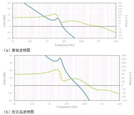 一般來(lái)說(shuō),11.3KHz應(yīng)該是VRM的管轄范圍,此處出現(xiàn)較大噪聲說(shuō)明VRM電路設(shè)計(jì)不能滿(mǎn)足要求。這里對(duì)VRM的性能進(jìn)行分析,VRM分析的方法眾多,此處主要采用仿真其反饋環(huán)路波特圖的手段。波特圖主要觀(guān)察幾個(gè)關(guān)鍵信息:1、穿越頻率,增益曲線(xiàn)穿越0dB線(xiàn)的頻率點(diǎn);2、相位裕度,相位曲線(xiàn)在穿越頻率處所對(duì)應(yīng)的相位值;3、增益裕度,相位在-360°時(shí)所對(duì)應(yīng)的增益值。這里我們主要關(guān)注穿越頻率和相位裕度這兩個(gè)指標(biāo)。從VRM的環(huán)路波特圖(如下圖a)可以看到,VRM的穿越頻率在8KHz左右,相位裕度37度。這里存在兩個(gè)問(wèn)題:首先VRM的相位裕度一般需要大于45度才能保證環(huán)路的穩(wěn)定工作,這里相位裕度稍小一些,需要增加相位裕度;其次穿越頻率太低,穿越頻率附近VRM的調(diào)整作用逐漸降低,而此頻點(diǎn)bulk電容還起不到作用,所以在8KHz附近會(huì)存在較高的阻抗,這個(gè)頻點(diǎn)的噪聲抑制作用較差。下圖(b)是優(yōu)化VRM環(huán)路之后的波特圖,調(diào)整相位裕度到50度,穿越頻率推到46KHz左右。