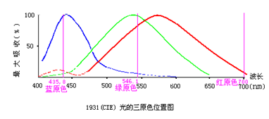 1931年國際照明委員會(huì)(CIE)規(guī)定紅、綠、藍(lán)三種原色光的波長分別為:700nm、546.1nm、435.8nm。為了理論闡述上的方便,我們把這三種原色光的位置標(biāo)記在“視網(wǎng)膜視錐細(xì)胞的光譜吸收曲線圖”上,(見下圖)。在這張