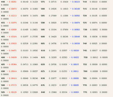 對(duì)于440nm到545nm這一段與380nm到435nm這一段中的光譜三刺激值的“負(fù)值”大小的來源*其道理上來說,應(yīng)該與上述情況是一樣的。在此不做繁瑣的推導(dǎo)。只給出結(jié)果。