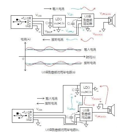 為了證明該理論,讓我們來看一個簡單的電路并考慮所示的連接。該基本電路包括三個要素,一個低壓差(LDO)線性調(diào)節(jié)器,一個微處理USB 數(shù)據(jù)線接到音頻驅動器,和一個揚聲器,所有這些都由一個連接到某個計算主機的USB插頭供電。在本例中,USB到音頻驅動器必須用3.3V供電。由于揚聲器采用音頻驅動器的輸出供電,所以音頻輸入驅動器需要+3.3V LDO,其由USB連接器供電(+5V),這似乎可以得到一個顯而易見的結論,即可將它們放置在圖1(a)原理圖所示的位置。但是,在這種框架下,驅動揚聲器工作的電流在返回到電流源驅動器時會產(chǎn)生一個電壓反彈,該電壓反彈會反過來作用于LDO并*終影響到USB 連接器。在本例中,把USB數(shù)據(jù)轉換為音樂的基準電壓會以音樂播放的速率反彈。由于揚聲器電感所產(chǎn)生的相移會增大誤差,這將和由于電流提升產(chǎn)生的高音量混合在一起。電壓反彈也將導致紋波出現(xiàn),這將降低揚聲器發(fā)出的音質。
